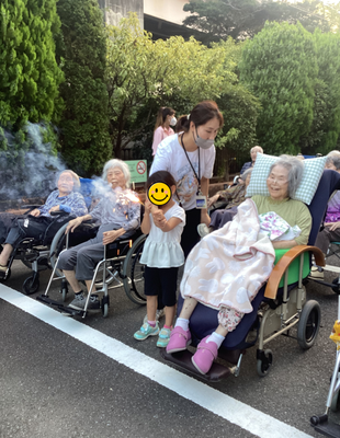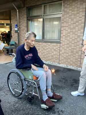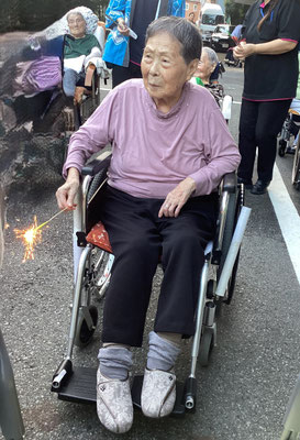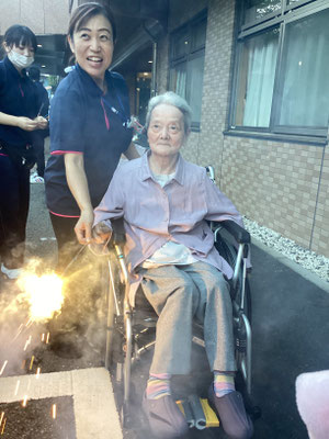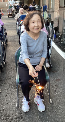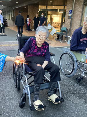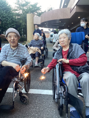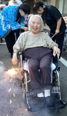 18時頃から利用者様方に手持ち花火をお配りし、職員が注意を払いながら順番に着火します🎇ニコニコ笑顔を見せて下さる方や、ちょっとこわーい💦とおっしゃる方もいらっしゃいましたが、花火の燃える音やにおい、持ち手から伝わる振動など、夏の風物詩をお楽しみいただけたのではないでしょうか☺