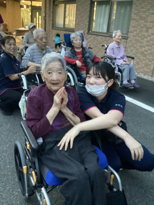 連日猛暑日で夕方になっても暑さが続いていましたが、幸いなことにこの日は夕方から少し風があったので打ち水を入念にし利用者様も大勢見物に降りていらっしゃいました。